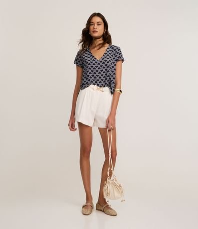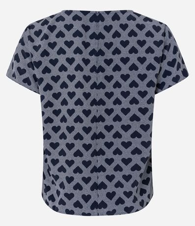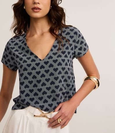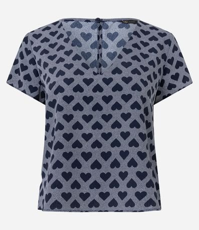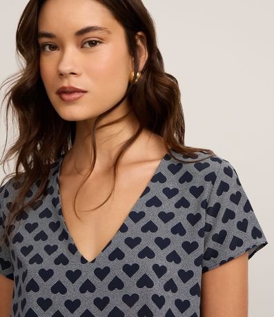 Ref: Blusa de mangas curtas, confeccionada em crepe, com decote V e estampa de corações. Este produto foi fabricado através de processos mais sustentáveis, sendo ambientalmente mais responsável.