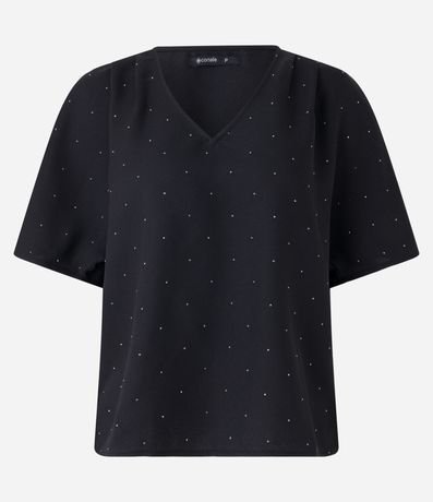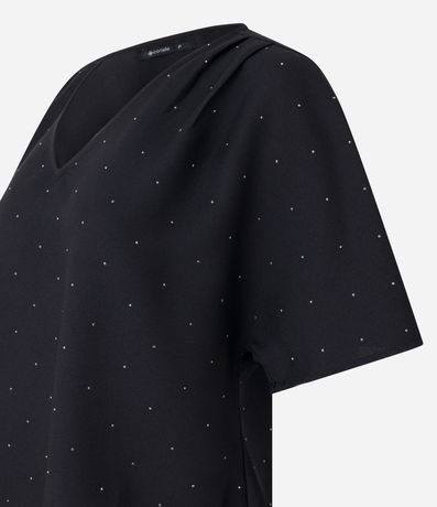 Blusa feminina, confeccionada em crepe, com decote V, mangas curtas, detalhe drapeado no ombros e aplicação de hot fix.