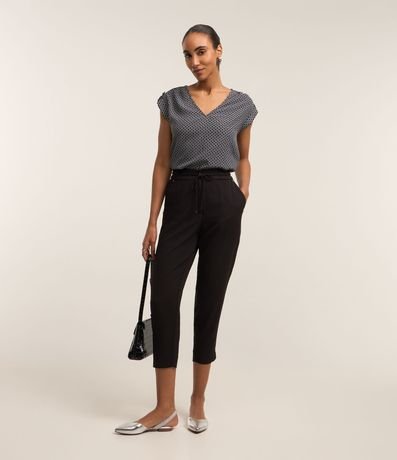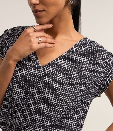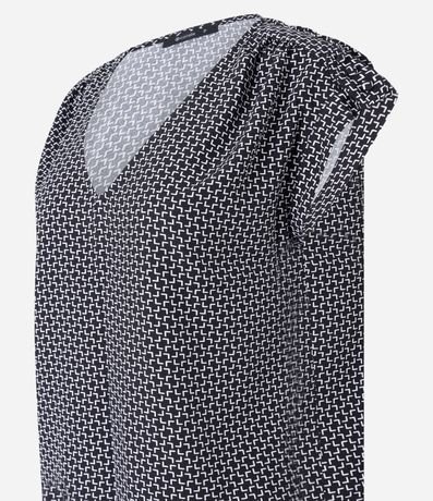 Blusa feminina, confeccionada em crepe, com decote V, mangas curtas sem cava, detalhe franzido no ombro e estampa geométrica.