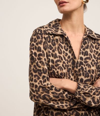 Blusa de mangas longas, confeccionada em crepe, com colarinho na gola V. Peça tem estampa de animal print de onça e botões nos punhos.