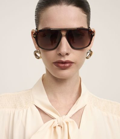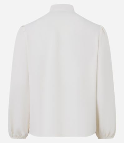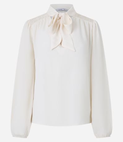 Blusa feminina, confeccionada em crepe, com laço na gola, mangas longas, sem estampa.