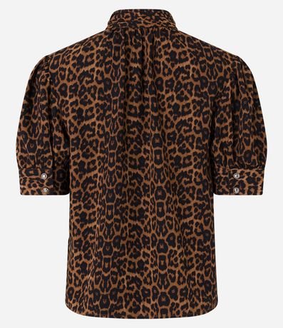 Blusa em crepe, com golinha alta, abotoamento na gola, mangas curtas bufantes e estampa oncinha.