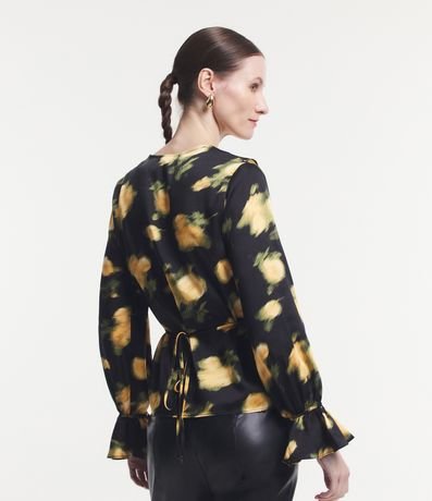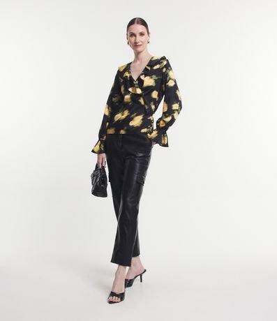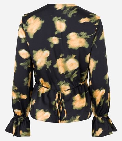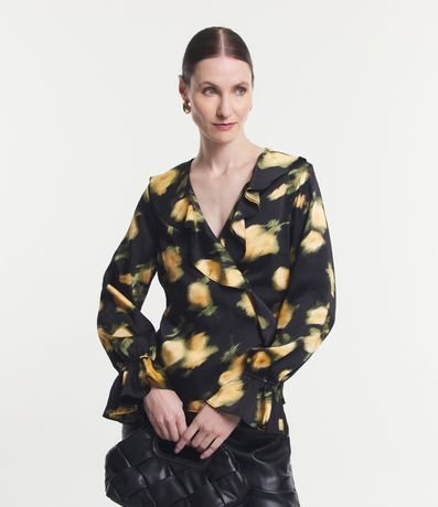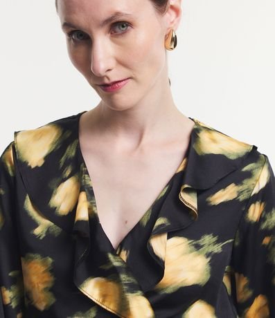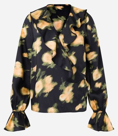 Ref: Blusa em crepe, com decote V, jabô, babados nos punhos e estampa floral distorcida.