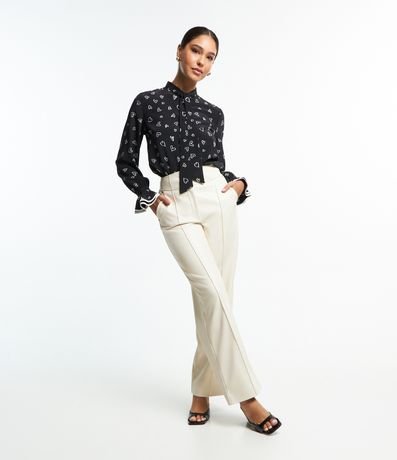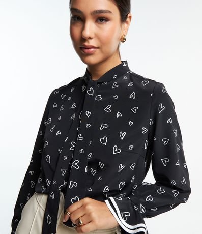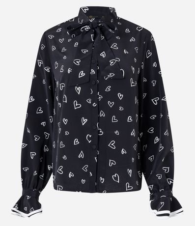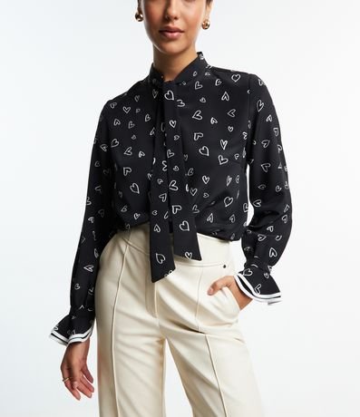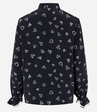 Blusa feminina, confeccionada em crepe, com gola média, laço e abotoamento frontal. A peça também conta com babadinho no punho e estampa corações.