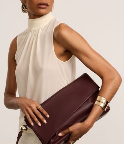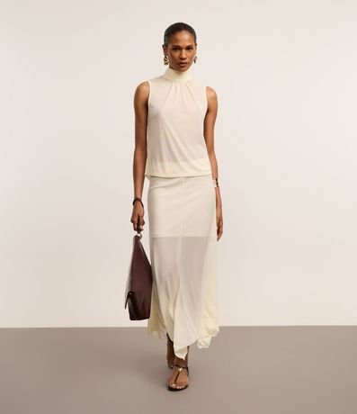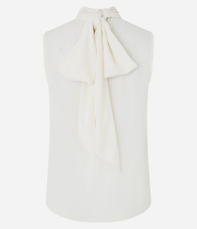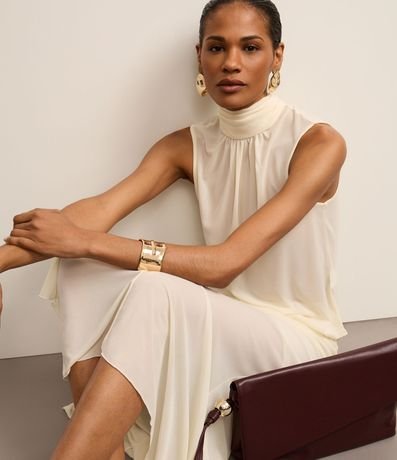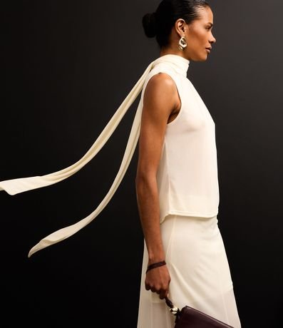 Ref: Blusa sem mangas, confeccionada em crepe, com golinha alta com amarração por tiras longas de tecido. A peça tem fechamento por gota com detalhe de pérola artificial atrás do pescoço e franzidos na parte frontal.