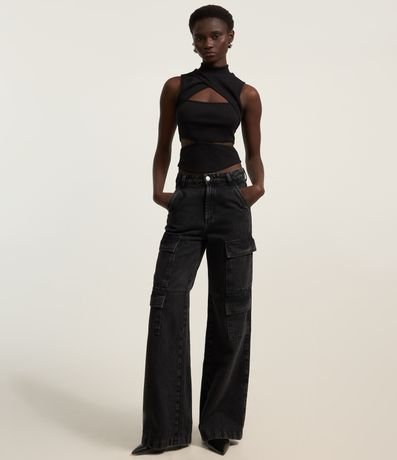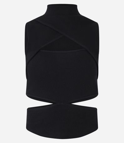 Blusa justinha, curta com gola alta, confeccionada em helanca, sem manga e com recorte cut out.