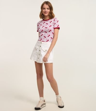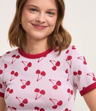 Ref: Blusa manga curta, confeccionada em jacquard, detalhe na gola e barra da manga contrastantes e estampa em repetição de cerejinhas.