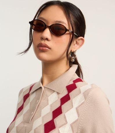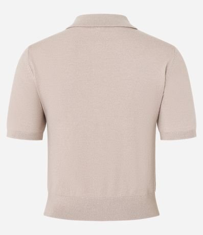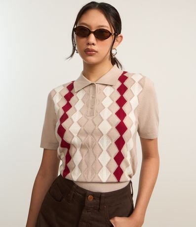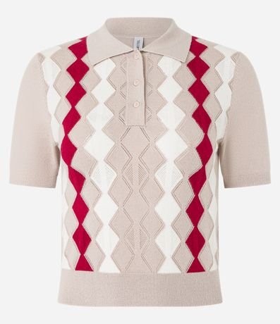Ref: Blusa manga curta, golinha polo com botões, confeccionada em jacquard com viscose certificada mais sustentável e estampa frontal geométrica.