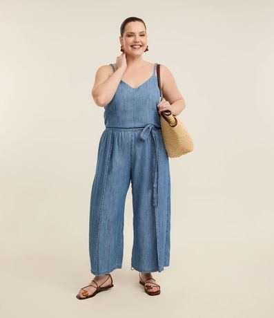 Ref: Blusa feminina Curve & Plus com decote em v, alças finas ajustáveis. Peça confeccionada em algodão certificado bci com baixo consumo de água.