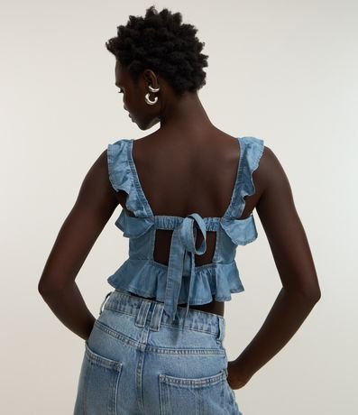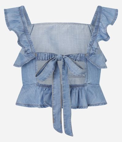 Ref: Blusa com alças largas, confeccionada em jeans, babados e amarração nas costas.