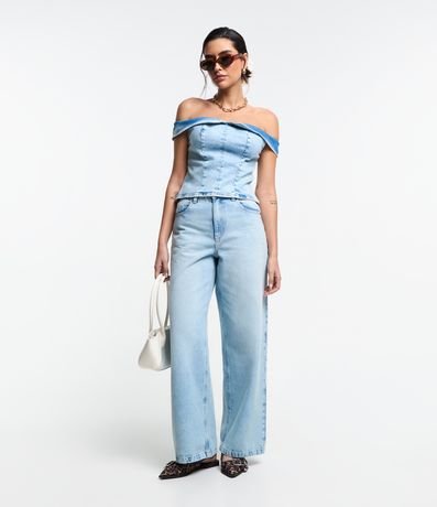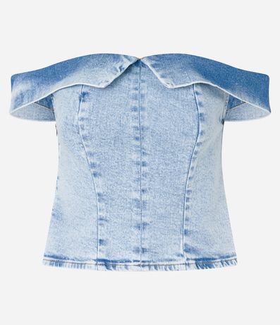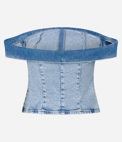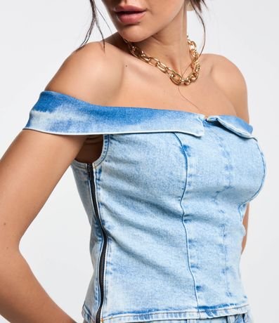 Ref: Blusa sem mangas confeccionada em jeans com decote ombro a ombro pala virada, recortes verticais e abertura lateral por zíper. Possui tecido com toque amaciado.