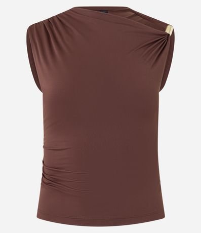 Blusa confeccionada em jersey com decote diferenciado, franzidinhos e aviamento em metal.