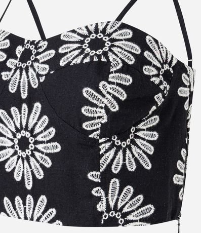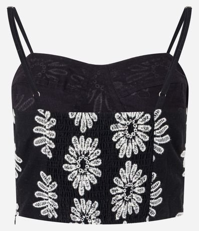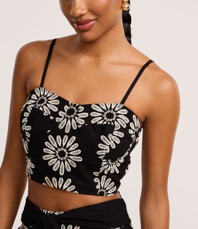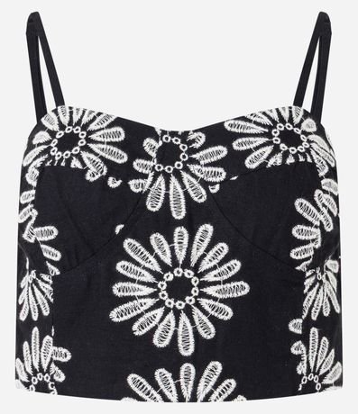 Ref: Blusa sem mangas, confeccionada em laise, com alcinhas finas reguláveis e bordados florais. Este produto possui algodão certificado em sua composição, sendo ambientalmente mais responsável.