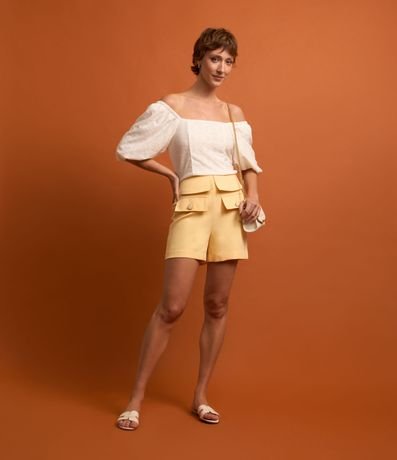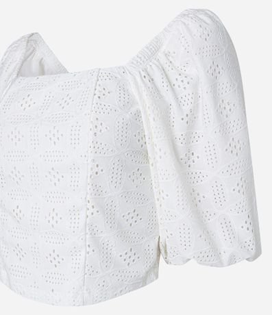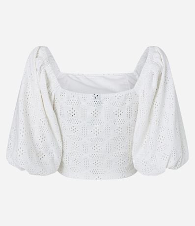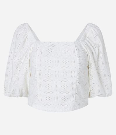 Blusa feminina, confeccionada em laise mais sustentável, com decote quadrado e  manga bufante