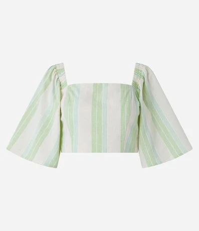 Blusa em Linho com Listras em Fio Tinto e Manga Ampla 3/4