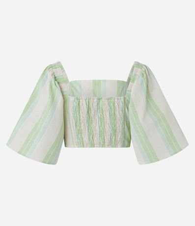 Blusa listrada em fio tinto, manga 3/4 ampla, lastex nas costas e confeccionada em linho.