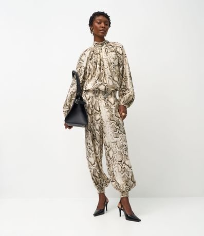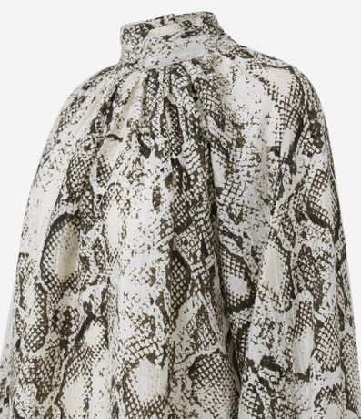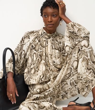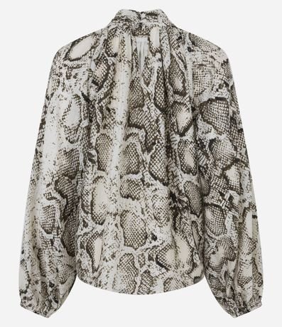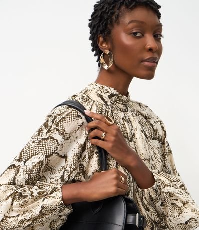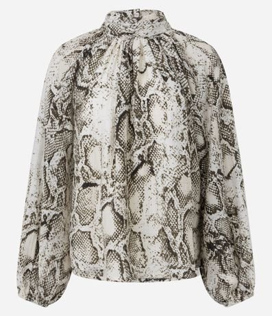 Ref: Blusa feminina em chiffon com estampa animal print, gola alta estruturada, franzidos no decote e mangas longas bufantes, com punhos ajustados.