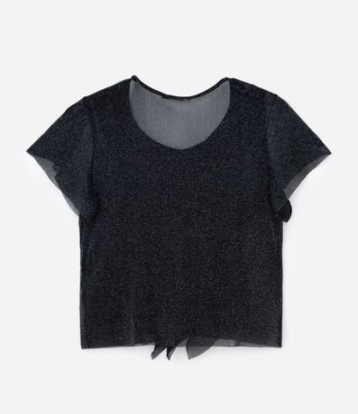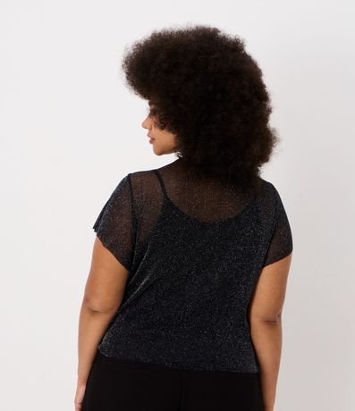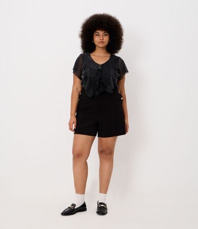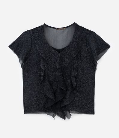 Ref: Blusa confeccionada em malha brilhozinha e transparente. A peça tem golinha, babados frontais e forro regata.
