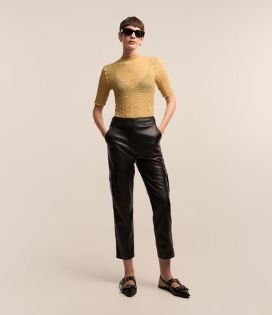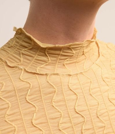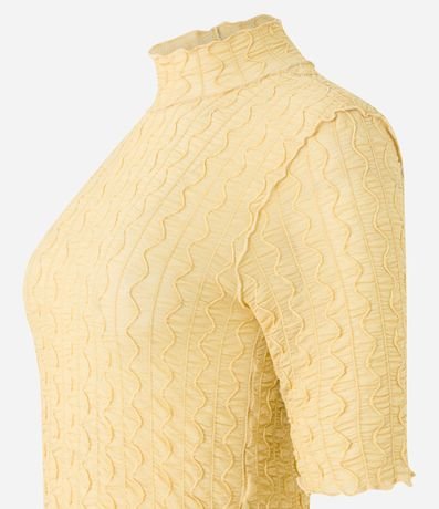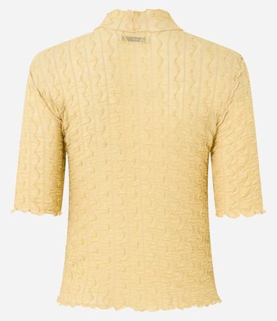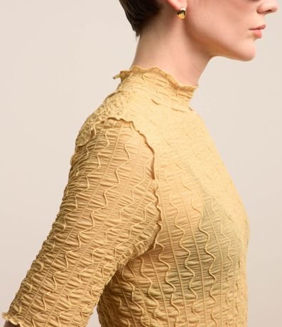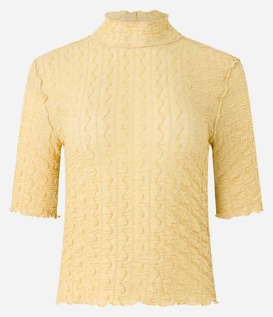 Blusa feminina, confeccionada em poliamida, com golinha alta, mangas 3/4 e texturas.