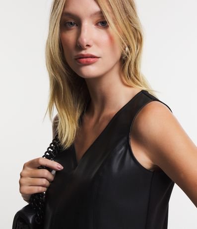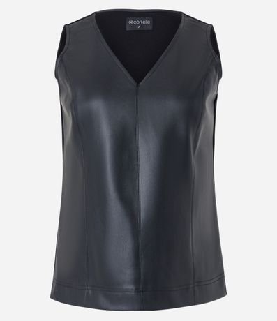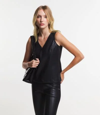 Blusa sem manga feminina, confeccionada em material sintético e ponto roma, com decote V e recortes.