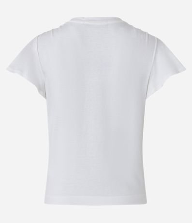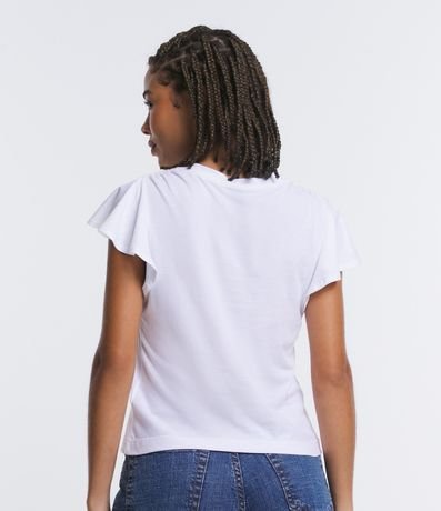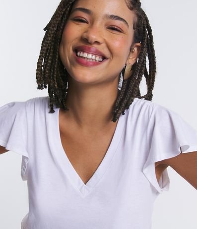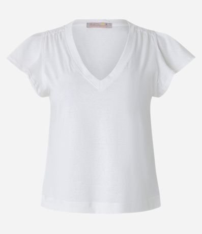 Blusa em meia malha, com decote V, mangas curtas soltinha e superfície sem estampa.