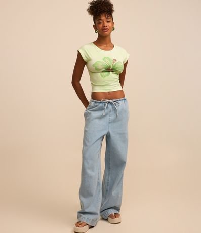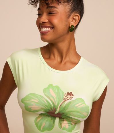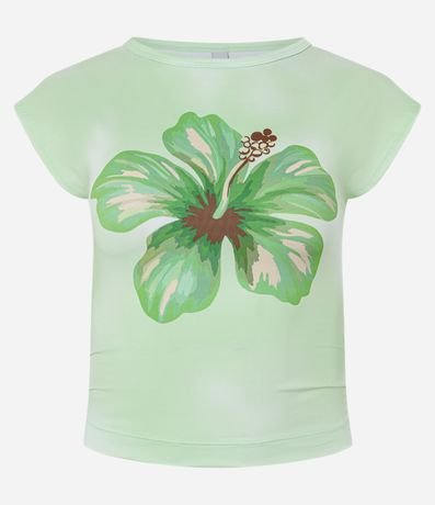 Blusa manga curta, confeccionada em microfibra leve e com estampa frontal de hibiscos.