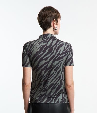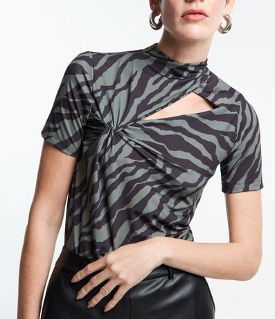 Ref: Blusa feminina, confeccionada em microfibra, com golinha alta, mangas curtas, recortes vazados e nós assimétricos. A peça também possui estampa animal print zebra.