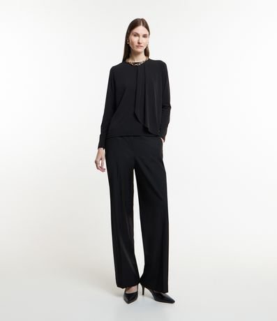 Blusa feminina, confeccionada em microfibra, com gola redonda, prega frontal e sobreposição em tecido fluido.