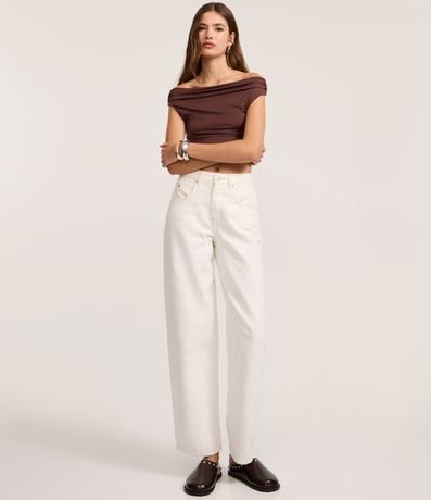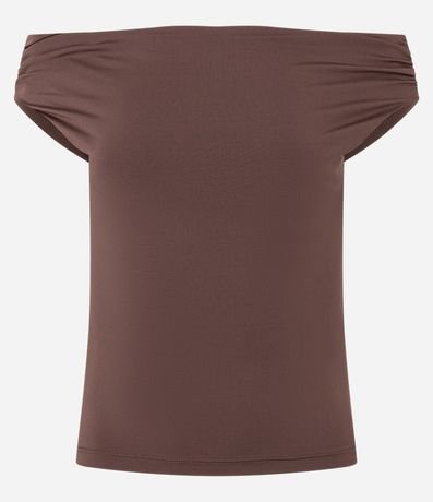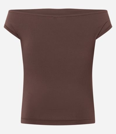 Ref: Blusa feminina confeccionada em microfibras no modelo ombro a ombro com decote degagê e manga curta.