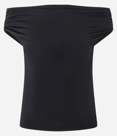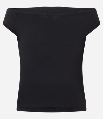 Ref: Blusa feminina confeccionada em microfibras no modelo ombro a ombro com decote degagê e manga curta.