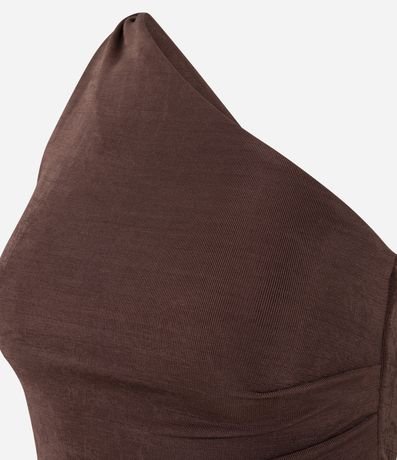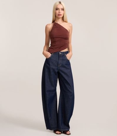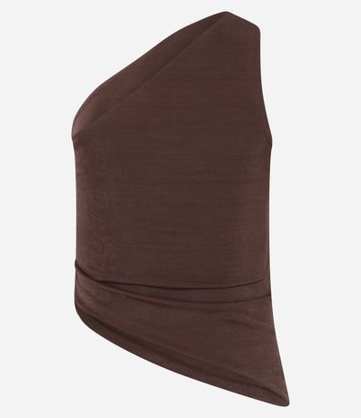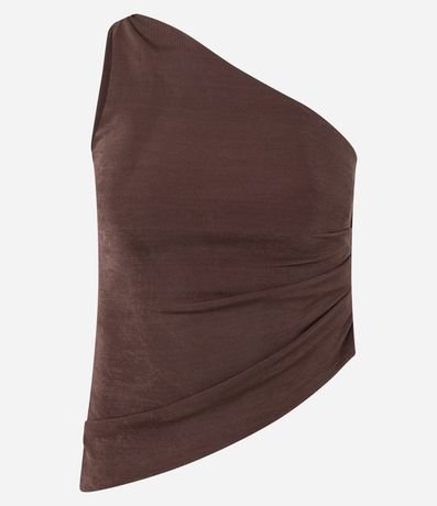 Blusa feminina confeccionada em microfibra, no modelo ombro só. Possui torcidinho no ombro, sem mangas, pregas laterais, sem estampa e barra assimétrica.