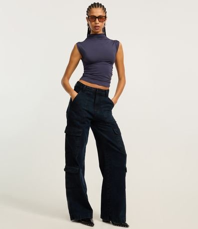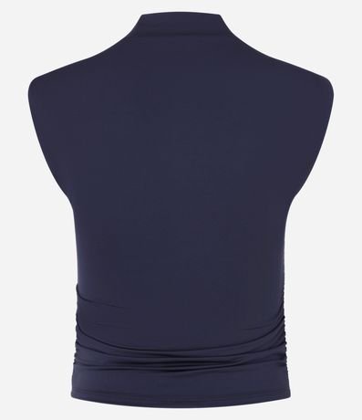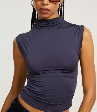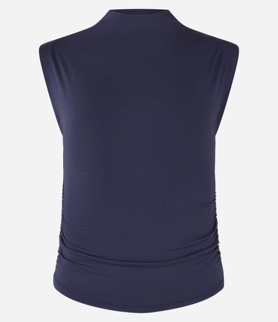 Blusa sem manga, confeccionada em microfibra com franzidinho nas laterais e gola alta.