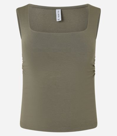 Blusa feminina, confeccionada em moletinho, com decote quadrado, alças médias e detalhe charmoso franzido nas laterais.