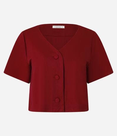 Ref: Blusa confeccionada em piquet de viscose mais sustentável. A peça lisa tem decote V, botões forrados e mangas curtas.