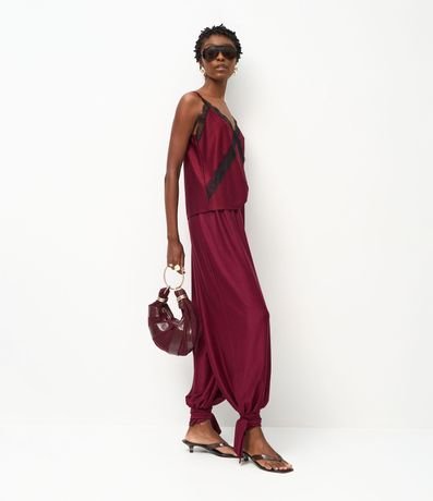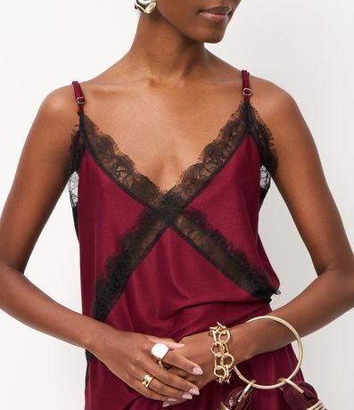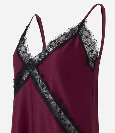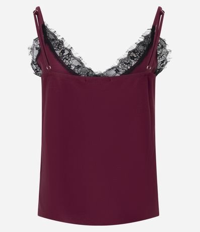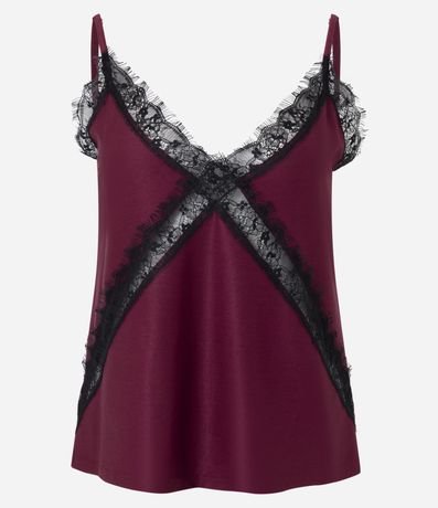 Ref: Blusa feminina sem mangas em piquet. A frente apresenta aplicação de renda delicada formando desenho em X. O decote é em V, enquanto as costas seguem com superfície uniforme e caimento reto.