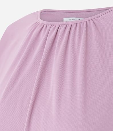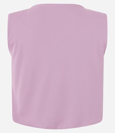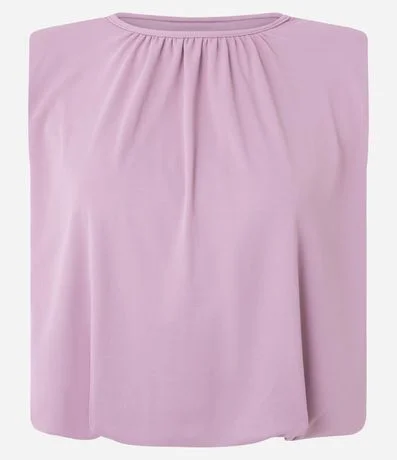 Blusa com ombreiras e sem mangas, confeccionada em poliamida, com gola redonda. Roupa com franzidos abaixo da gola. Peça com forro.