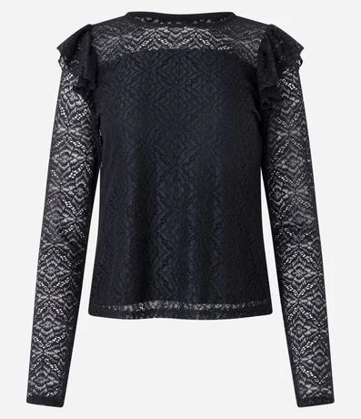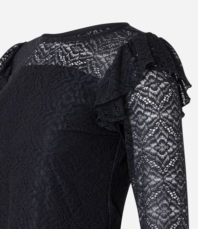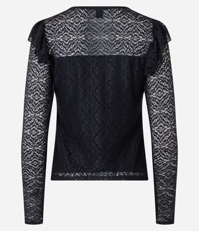 Blusa em renda, com gola redonda, mangas longas, babado no ombro e textura rendada.