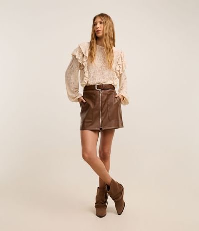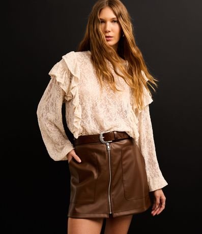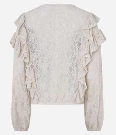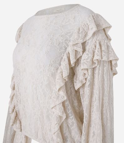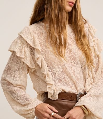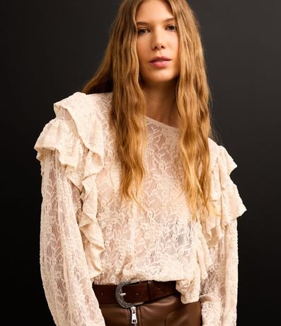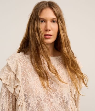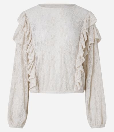 Ref: Blusa de mangas longas, confeccionada em renda, com gola redonda e babados nas laterais. A renda do tecido tem textura de flores. Este produto possui viscose certificada em sua composição, sendo ambientalmente mais responsável.