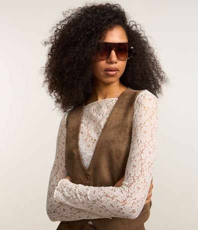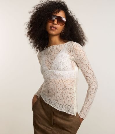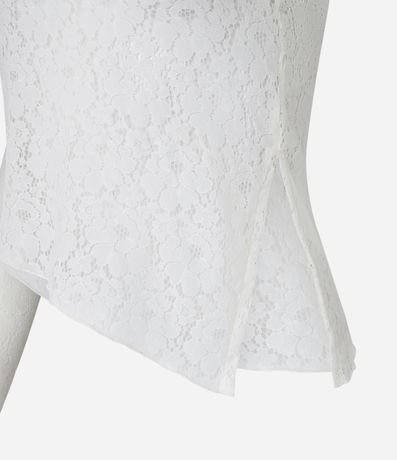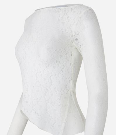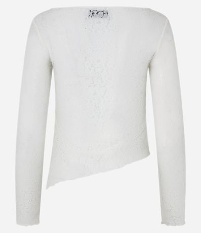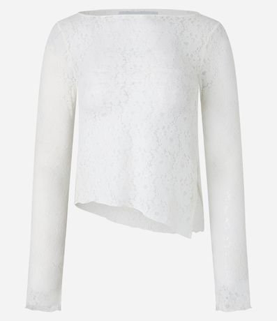 Ref: Blusa manga longa, confeccionada em renda floral, texturizada, com forro e barra assimétrica.