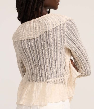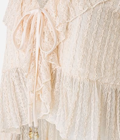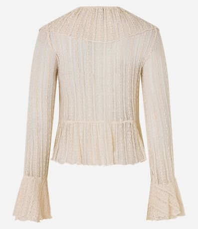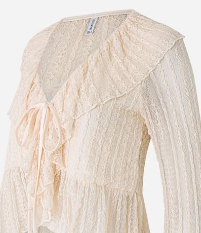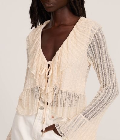 Ref: Blusa feminina em renda com decote v, babados, amarração e textura com manga longa.