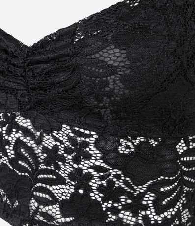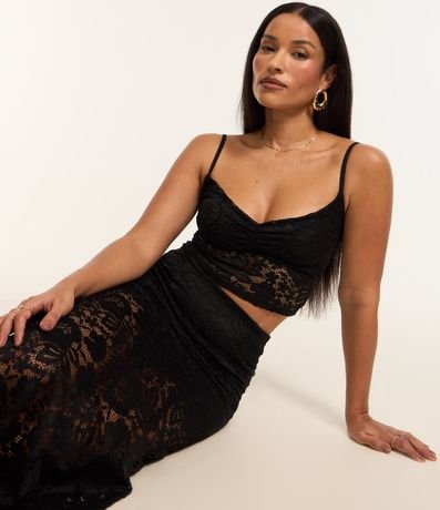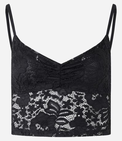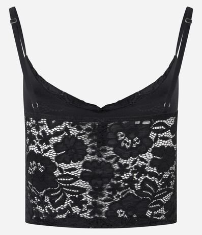Ref: Blusa feminina confeccionada em renda floral, peça com decote em v, alças finas e transparência.