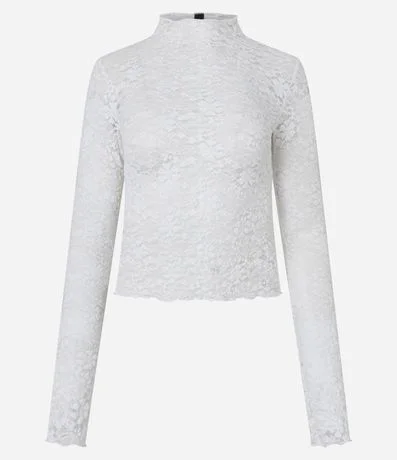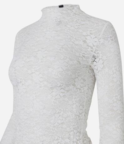 Blusa feminina com modelo ajustado, confeccionada em renda texturizada que valoriza a superfície delicada. Possui gola alta, mangas longas e barra reta, garantindo visual sofisticado para compor looks elegantes e modernos.