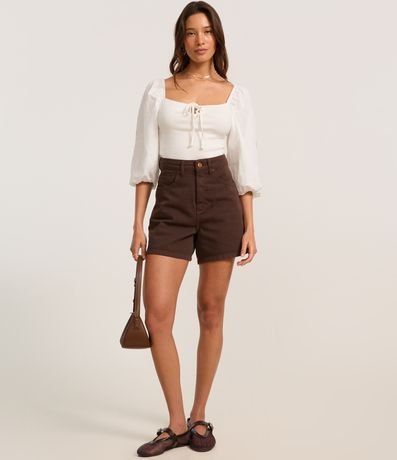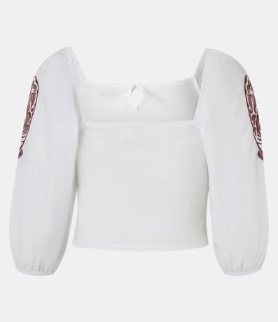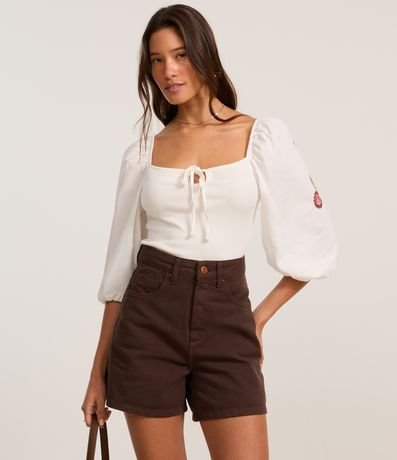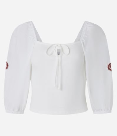 Blusa em Ribana com Amarração e Manga Bordada Paisley