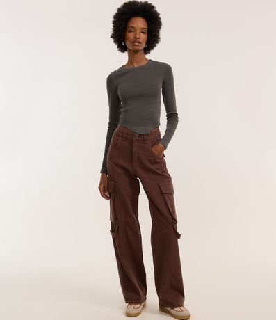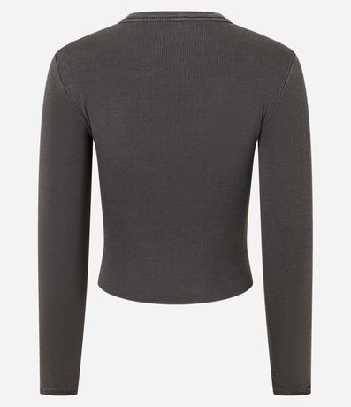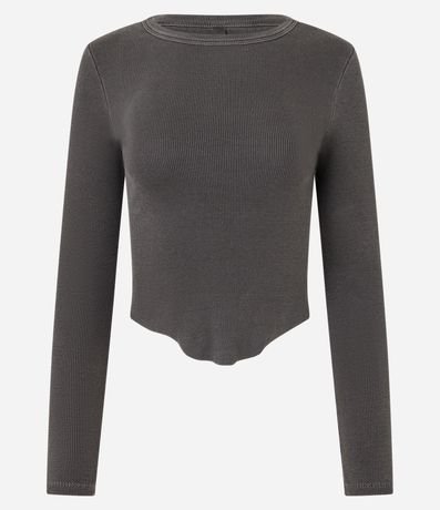Ref: Blusa feminina confeccionada em ribana de algodão mais sustentável. Peça com gola redonda, manga longa, efeito de lavagem e barra assimétrica.