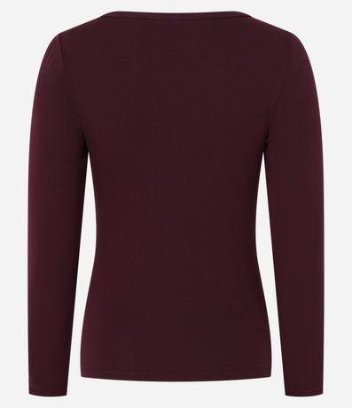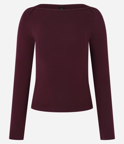 Blusa feminina, confeccionada em ribana, com gola canoa, detalhe sobreposto no ombro e superfície sem estampa.