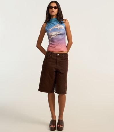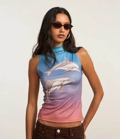 Blusa sem manga com golinha alta, confeccionada em ribana com leve textura, fundo degradê e estampa frontal de golfinhos.