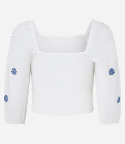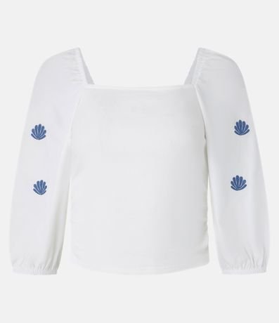 Blusa feminina confeccionada em ribana mais sustentável. Possui decote quadrado, mangas bufantes, com punhos ajustados e bordado de conchas.