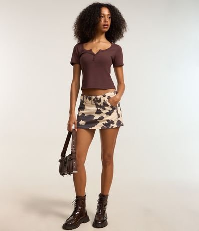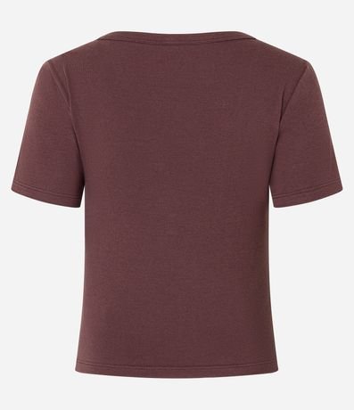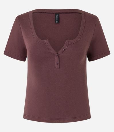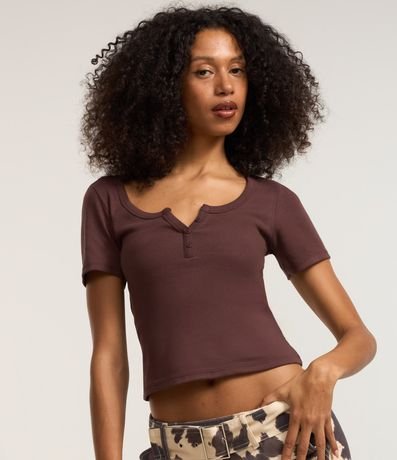 Ref: Blusinha feminina de ribana de material mais sustentável, com gola redonda e detalhes de botões. Sem estampa.