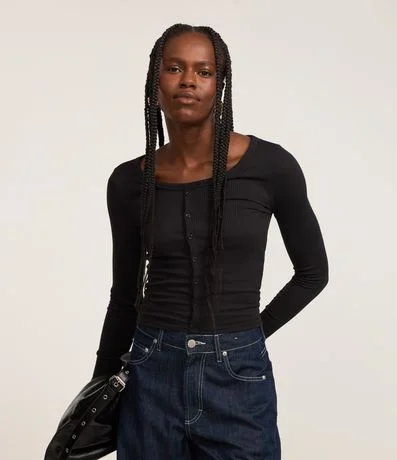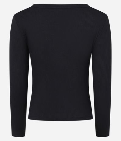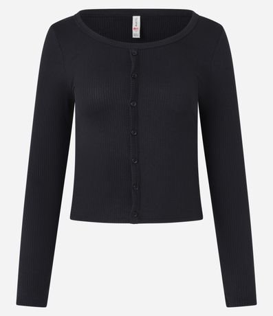 Ref: Blusa manga longa, confeccionada em ribana com boas práticas ambientais, leve textura de listrinhas e botões frontais.