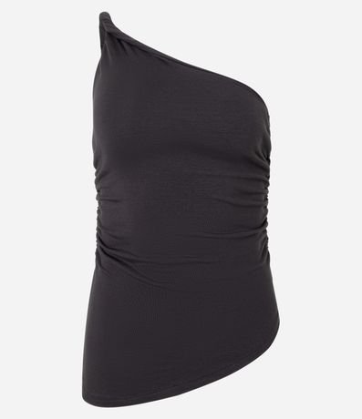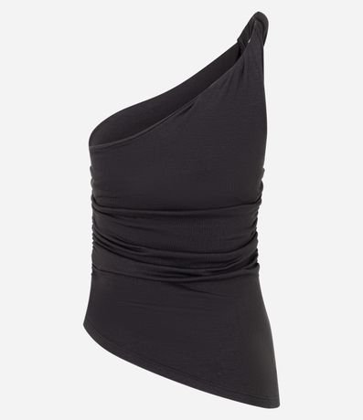 Blusa com decote um ombro só, alcinha fina torcidinha, confeccionada em ribana com viscose certificada e drapeado na lateral.